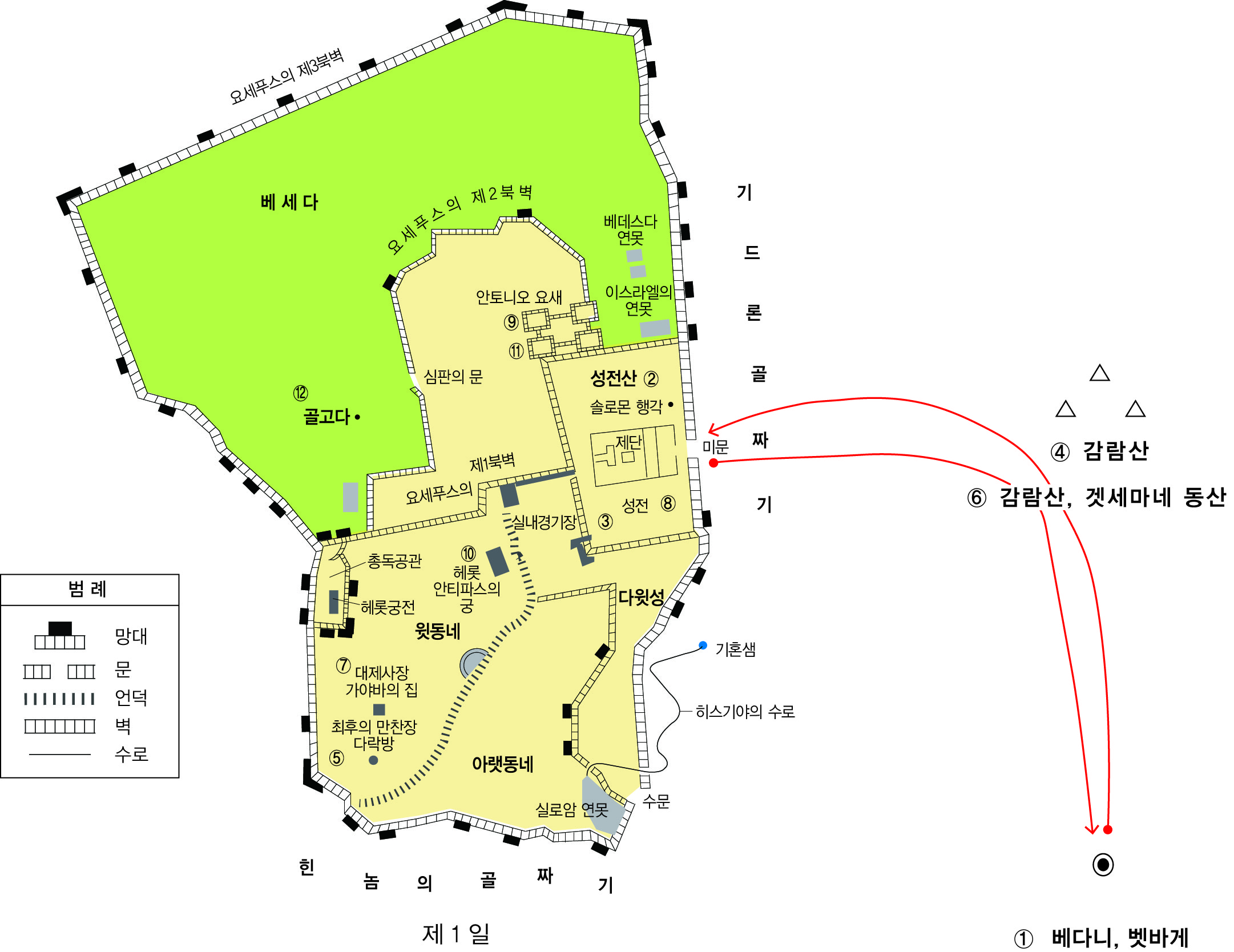 예수님 이동 경로 ① 베다니, 벳바게 ⟶ ② 예루살렘 입성 ⟶ ① 베다니로 돌아오심