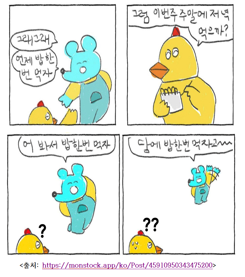 그때만 해도 지금처럼 한국어교재가 흔하지 않아 주교재 외에 그날그날 한두 가지 주제를 정하여 프리토킹으로 수업을 하곤 했다. 그런데 어느 날 한 학생이 “선생님, 한국인들은 약속을 잘 안 지켜요.”라면서 친구들이 ‘밥 한번 먹자’ 해놓고 여태껏 연락이 없다는 것이다.