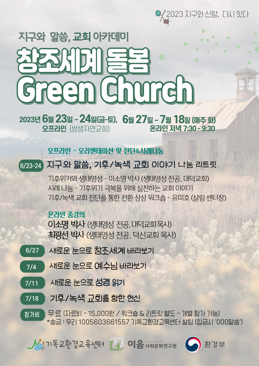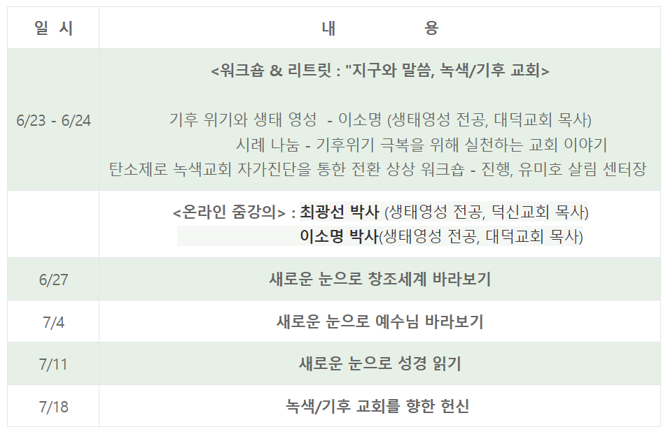 오프라인과 온라인으로 함께 진행되는 이번 아카데미는 녹색교회를 세우는 생태영성과 기후위기 극복을 위한 구체적인 실천을 나누는 리트릿과 4번에 걸친 온라인 줌강의가 진행될 예정이다.