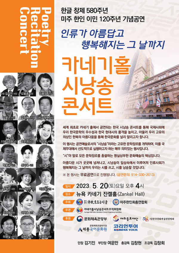 한글 창제 580주년 미주 한인 이민 120주년 기념 카네기홀 시낭송 콘서트가 카네기홀 시낭송 콘서트 조직위원회 주관으로 뉴욕카네기홀 잔켈홀에서 5.20(토)에 개최됐다. 조직위원회 구성은 단장 김기진, 부단장 여운만, 총감독 김창현 ,조감독 김창회이다.