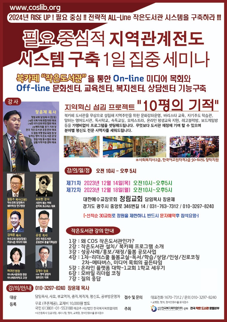 (사)한국복지목회협의회는 작은도서관에 대한 관심과 참여가 늘어감에 따라 12월14일(목) 제71차, 12월18일(월) 72차 북카페작은도서관 설립세미나를 경기 광주 청림교회에서 무료세미나를 개최한다. 부흥과 성장의 모멘텀을 찾기 원하는 교회와 관계자는 누구나 참여할 수 있다.