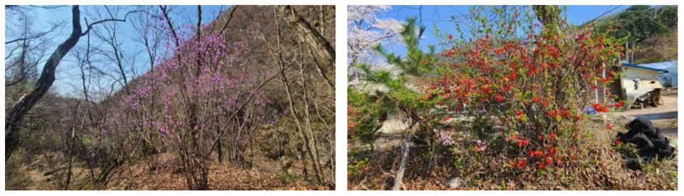 큰 골에서 힘차게 흘러내리는 계곡을 가로지르는 조그만 다리, 관청교 옆으로 이어지는 아스팔트길을 따라 산쪽으로 발걸음을 옮겼다. 명자나무 꽃, 복숭아꽃, 살구꽃이 피어있는 담장 너머로 전형적인 산골 집들이 한가롭고 아담하게 자리 잡고 있다. 조금 더 걸어 오르니 전원주택과 고급스럽게 보이는 음식점도 보인다.