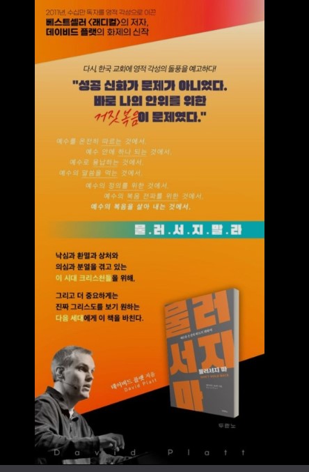 목사님은 말씀합니다. 예수를 따르는 순전한 복음에서 물러서지 않는 복음 인생을 살자. 순전한 복음으로 돌아가야 한다.그리고 주님이 원하시는 아름다운 연합과 그분이 꿈꾸시는 교회와 가정을 이루는 일에 물러서지 말자. 이제 우리의 열심과 최선이 아닌 예수의 영광을 위해 살자.