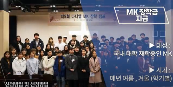 ●MK 다니엘 장학금 지급_ 열방에서 사역중이신 선교사님들을 위해 기도하며 동역하는 마음으로 선교사 자녀를 위한 다니엘 장학금 지원을 하고 있다. 매년 1억의 장학금을 50명을 선발하여 2백만원을 지급한다.
