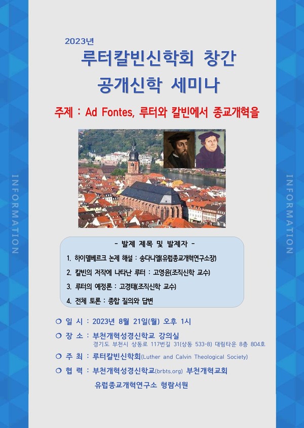 8월 21일(월) 오후 1시, 루터칼빈신학회(대표 고경태 박사)가 1회 신학세미나를 부천개혁성경신학교(학장 이천우 목사)에서 개최한다.