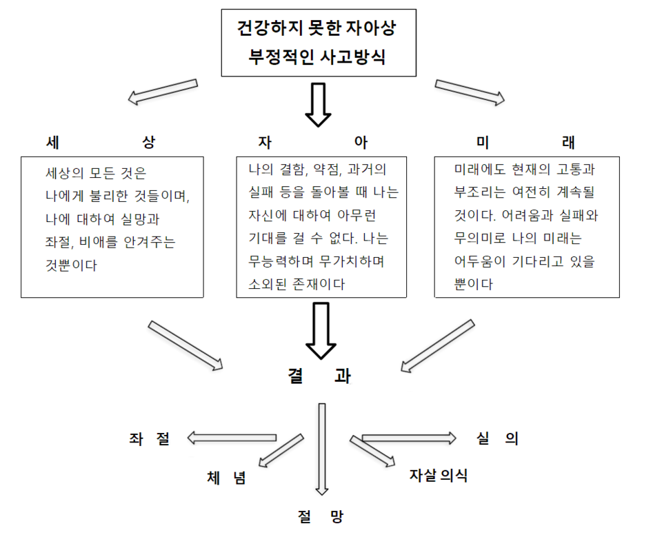 더 나아가 부정적 자아상을 가진 사람들은 어려움이나 현실에서 다가오는 문제들을 도전하고 극복하여 앞으로 나아가지 못하고 도피하고 회피하려 한다. 책임도 전가하고 스스로 자기 실패의 구덩이로 들어간다.