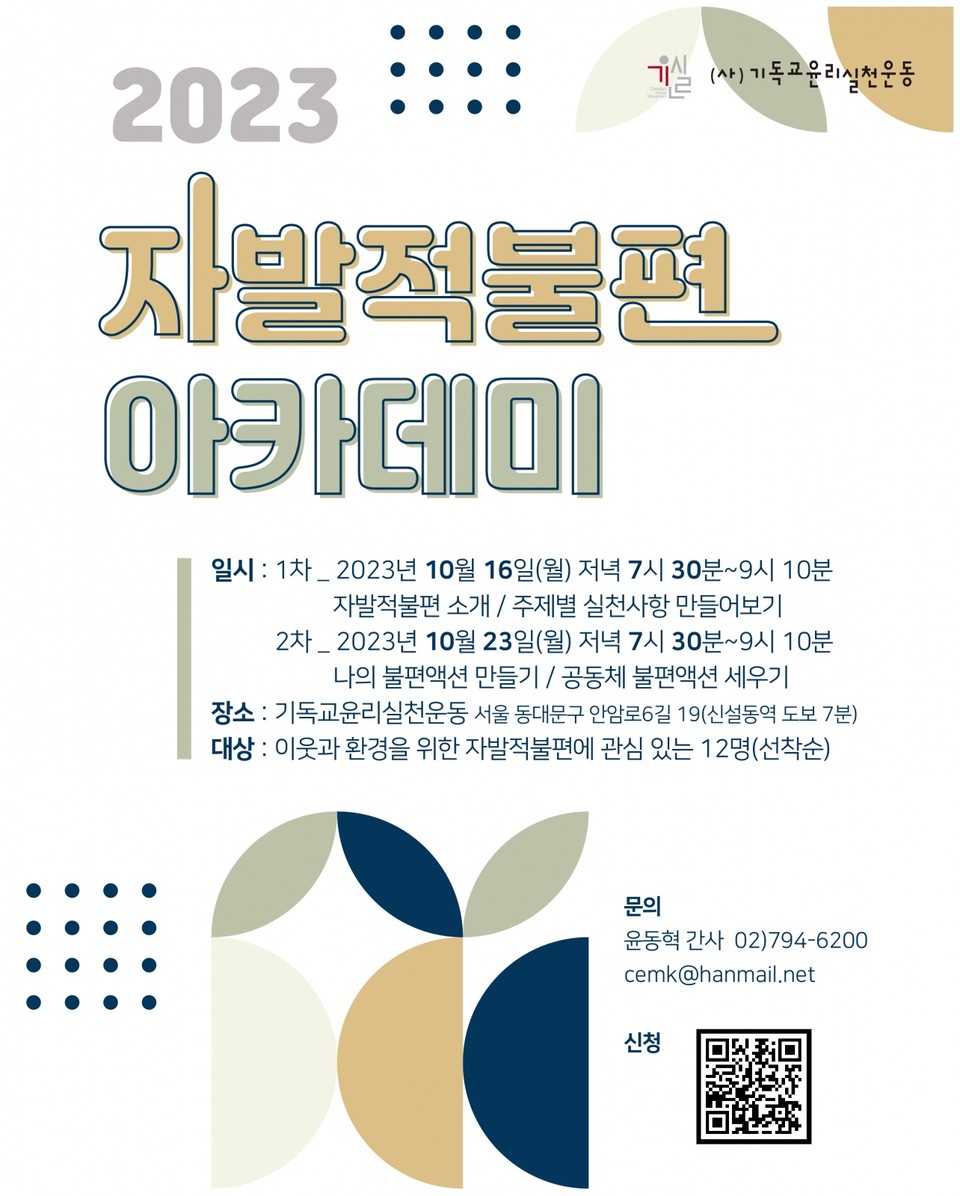기윤실은 오는 10월 16일(월)과 23일(월) 양일간 <2023년 기윤실 자발적불편 아카데미>를 진행한다고 밝혔다.