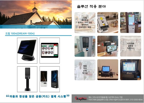 한국 최초의 헌금 키오스크 결제 시스템이다. 모든 신용카드와 직불카드 결제가 가능하다. 또한 5만원 이상 헌금 결제시 할부도 가능하다. 삼성페이, 모바일 카드 헌금 결제도 가능하다. 우리 회사만이 가지고 있는 경쟁력이다.