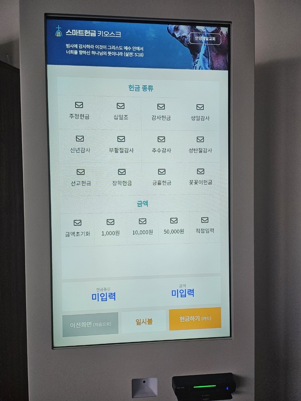 헌금을 키오스크로 결제하면 국세청과 연결되어 있기에 자동적으로 기부금 처리가 된다. 연말에 기부금 영수증을 제출하지 않아도 되고 자동적으로 세금 공제를 받을 수 있다.