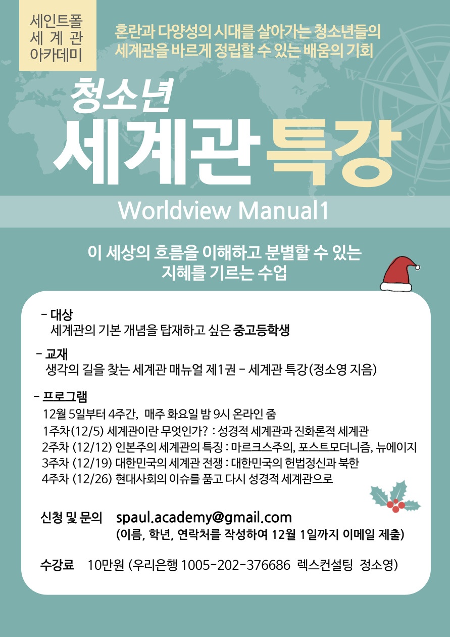 세인트폴 세계관 아카데미(대표 정소영 미국변호사)에서 12월 청소년 세계관 정규 수업을 진행한다. 중고생들을 대상으로 ‘청소년 세계관 특강 (이하 ‘세특’과정)으로 1년에 4회 진행되는 과정인데 2023년 마지막 수업이 12월 한 달 동안 진행될 예정이다.