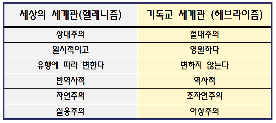 척 콜슨은 “교회란 무엇인가?”에서 두 세계관의 차이를 이렇게 설명하고 있다. 이것은 필자가 제시하는 내용과 같다.