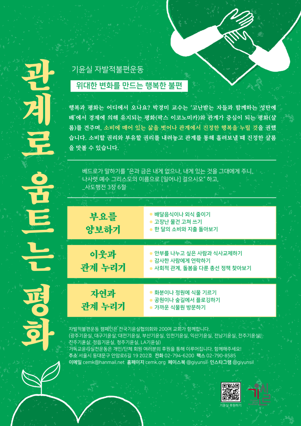 2024년 봄 캠페인은 "관계로 움트는 평화" 로 정하고 실천 항목들을 제시했다. 기윤실의 자발적불편의 실천 항목에 함께 동참하고, 소비할 권리와 부유할 권리를 내려놓고 관계를 통해 흘려보낼 때 진정한 샬롬을 맛볼 수 있을 것으로 기대된다.