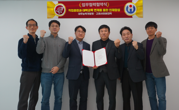 고려사이버대학교(총장 김진성)은 2월 27일, 대우능력개발원과 양 기관의 지속적 협력과 발전을 위한 업무협약을 체결했다고 밝혔다. 고려사이버대학교 정릉캠퍼스 진리관 5층 회의실에서 진행된 이번 업무협약에는 고려사이버대학교 나홍석, 김한성 교수, 산학협력단 조성관 팀장, 입학홍보팀 박주연 팀장과, 대우능력개발원 김욱석 대표이사, 오종환 전무이사가 참석하였다. 대우능력개발원은 37년의 역사를 가진 강북의 대표적 직업전문학교로, K-digital 트레이닝을 비롯한 다양한 국비과정 및 다양한 직업교육을 진행하고 있으며, 최근에는 SW개발, 보안, 빅데이터 등의 전문직업교육을 중점적으로 진행하고 있다.