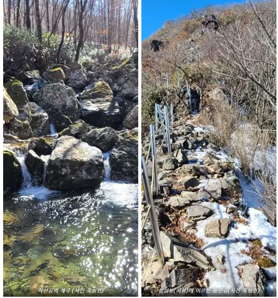 이제 본격적인 하산이 시작되었다. 햇빛이 들지 않아 눈이 쌓여 다져진 미끄러운 길을 계속 내려왔다. 한참을 내려와 할목재에 이르렀다. 나무에 얼어붙었던 얼음이 햇볕에 녹아내려 떨어지며 산죽을 두드리는 소리가 조용한 숲속을 진동시킨다. 툭-툭- 투두둑-.