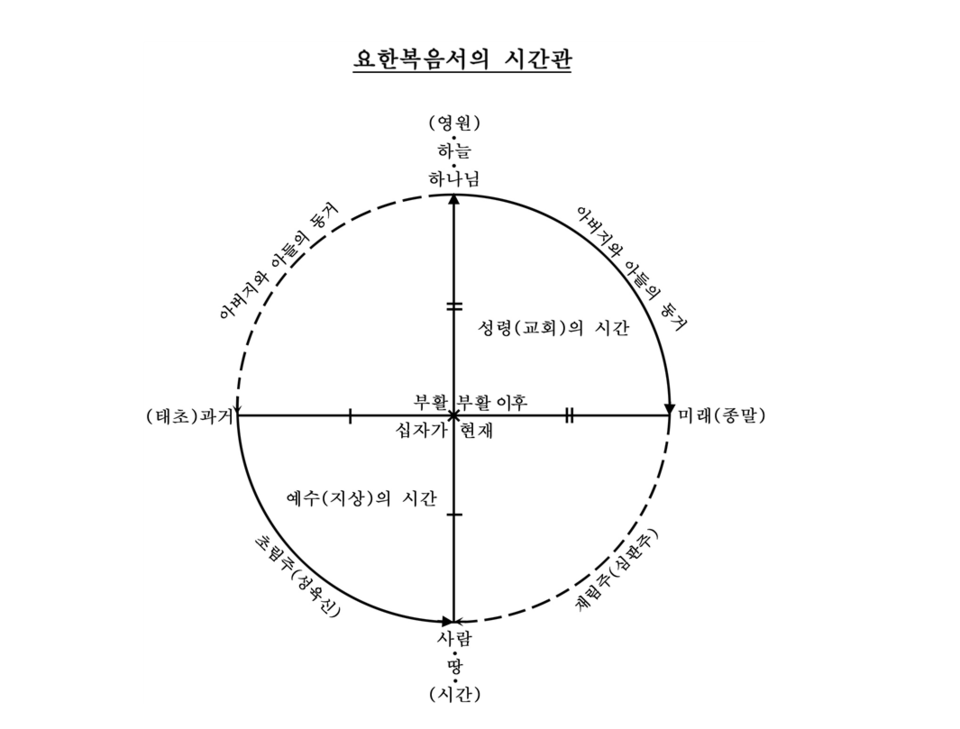 요한복음은 성자의 시간을 마지막 유월절을 기준으로 ‘역사적 수평적 시간’을 제1부(1-11장)와 제2부(12-21장)로 나누어 기술하고 있다. 나아가 요한은 부활 이후의 시간을 성자의 시간과 구분되는 보혜사 성령의 시간으로 규정지었다. 보혜사 성령의 시간은 예수의 사역을 대신해서 제자들이 복음을 전파하는 시간이요 교회의 시간으로서 예수가 재림할 때까지 계속되는 시간으로 규정지었다. 이 시간은 보혜사(성령, 교회)의 미래적인 직선적(선적) 시간과 부활-승귀-영광을 얻으신 예수의 영원 회귀적인 ‘순환적-원적 시간’으로 나누어진다. 이를 도표로 그리면 다음과 같다.