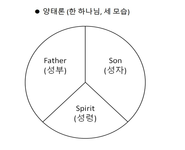 유대교는 야웨, 이슬람교는 알라라는 한 하나님을 신봉하는 ‘유일신교’(Monotheism)이다. 그런데 기독교는 성부, 성자, 성령이라는 세 분의 하나님을 말하므로 이는 ‘다신교’(Polytheism)로 여겨질 소지가 있다. 그래서 일신교(一神敎)도 아니고, 삼신교(三神敎)도 아닌, 세 분이 하나라는 삼위일체론(三位一體論)이 형성되었다. 이를 잘못 이해한 주장이 있다. 가령, 한 아버지가 집에서는 아빠이고, 교회에서는 장로이고, 회사에서는 사장이라는 식의 이해이다. 이는 양태론적 삼위일체론으로, 기독교의 정통 삼위일체론과 다른 빗나간 주장(이단)이다.