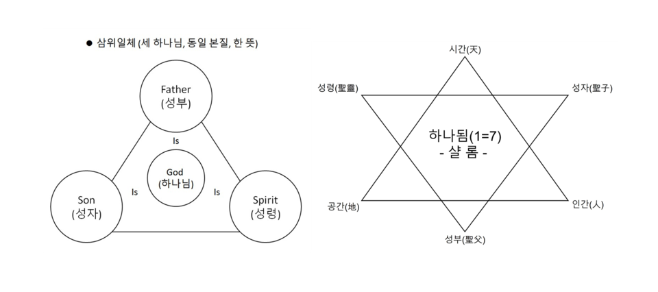 여기서 기독교의 ‘삼위일체론’(trinity)과 관련하여 한 가지 분명히 해야 할 것이 있다. 서구 기독교가 삼위일체 교리를 확립하는 과정에서 많은 고민이 있었다. 그것은 헬라적 사고에 기인한다. 헬라적 사고는 양손과 같이 분리를 전제로 한다. 반면에 히브리적 사고는 한 손의 양면과 같이 구분은 되지만 분리는 되지 않는다. 예를 들어보자. 왼손에 1을 쓰고, 오른손에 3을 쓸 경우 1은 1이고(1=1), 3은 3(3=3)이다. 1이 3이 될 수 없고(1≠3), 3이 1이 될 수 없다(3≠1). 이것이 분리를 전제로 한 헬라어의 특징이다. 그런데 한 손의 손등에 1을 쓰고, 손바닥에 3을 쓰면 3이 1(3=1)이고, 1이 3(1=3)이 될 수 있다. 이것이 구분은 되지만 분리는 되지 않는 히브리적 사고의 특징이다.