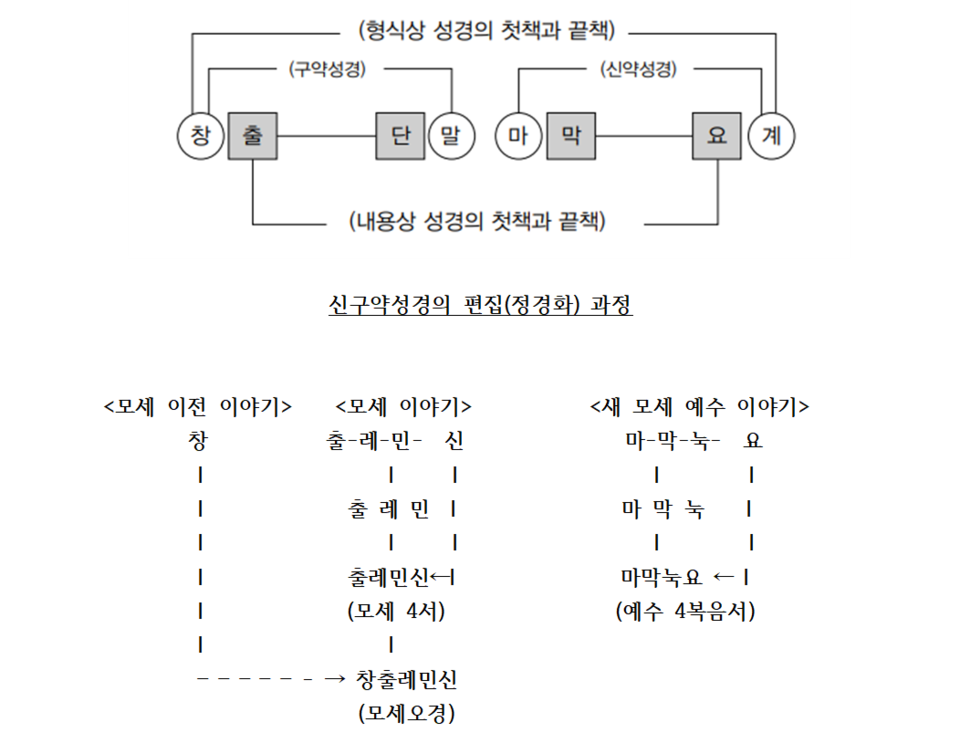 그런데 ‘새 모세 예수 이야기’를 말하는 사복음서의 편집(정경화) 과정을 살펴보면 최초의 복음서인 마가복음에 마태와 누가가 첨부(편집)되고, 최종적으로 요한복음이 첨부(편집)됨으로써 완성되었다. 이는 최종적으로 첨가(편집)된 요한복음이 사복음서의 완성적 의미를 갖는다. 그런데 초대교회가 남왕국에 속하는 예루살렘에서 시작되고 남왕국 전통이 주류가 되면서 신약성경은 형식상 ‘남왕국의 틀’(framework)로 짜였다. 그래서 신약성경은 남왕국에 속하는 마태복음과 요한계시록이 처음과 끝을 장식하는 구조로 엮어져 있다. 그런데 내용적으로는 북왕국에 속하는 마가복음과 요한복음이 처음과 끝을 장식하는 구조로 되어 있다.
