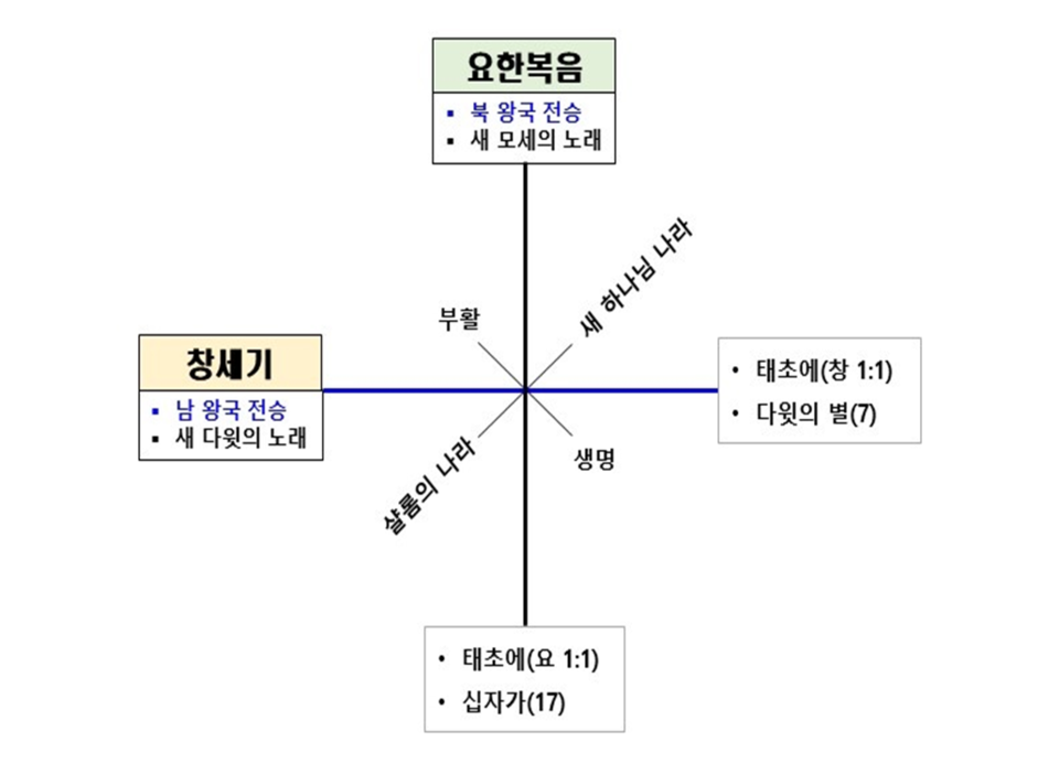 지금까지의 논의를 정리하면, 다윗과 관련된 숫자언어(7,14,70)나 그림언어(‘다윗의 별’이나 에덴동산)를 통해 창세기(특히 1-3장)는 남왕국 전승에 속하는 문서임이 분명히 드러났다. 따라서 전승사적 측면으로 보면 신구약성경은 남왕국 전승의 ‘태초에’(창 1:1)로 시작해서 북왕국 전승의 ‘태초에’(요 1:1)로 끝나는 구조로 되어 있다. 즉 창세기는 신구약성경의 ‘시작’이고, 요한복음은 그 ‘끝’을 장식한다.