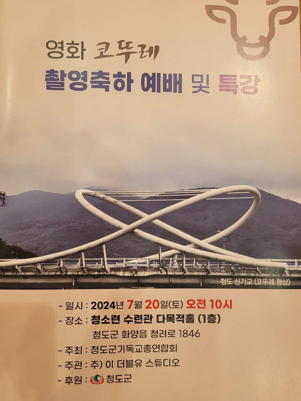 경북 청도에서 청도 지역을 중심으로 한 코뚜레 영화 코뚜레 촬영축하 예배 및 특강이 2024년도 7월20일 오전10시 청도군 화양읍 청려로 1846에 위치한 청소년 수련관 다목적홀 1층에서 청도군 기독교 총연합회 주최와 주)이 더블유 스튜디오 주관과 경북 청도군의 후원으로 열렸다.