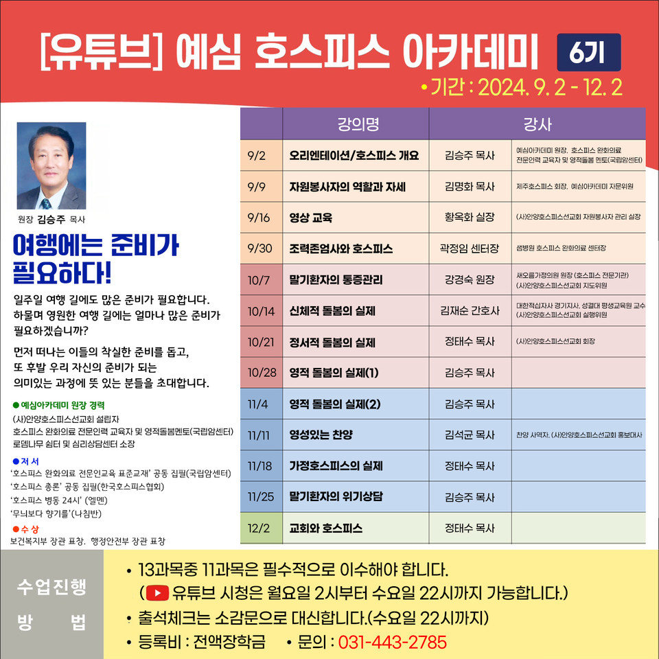 호스피스 사역의 이론과 실제를 준비하고 체험할 수 있는 예심 호스피스 아카데미가 6기 수강생을 모집한다고 밝혔다. 예심 호스피스 강의는 9월2일(월)부터 12월2일(월)까지 전체 13주 동안 전체 13과목 13강을 유튜브로 진행한다.
