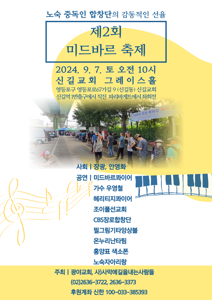 노숙인과 쪽방촌 주민들로 구성된 미드바르콰이어가 부르는 희망의 찬양 축제인 “제2회 미드바르 축제”가 오는 9월 7일 오전 10시 신길교회 그레이스홀에서 열린다.