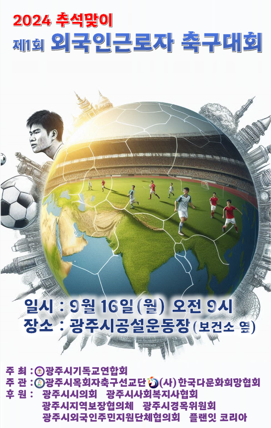 (사)한국다문화희망협회(회장 장윤제)와 광주시기독교연합회(회장 이충범 목사)가 공동으로 주최하고 광주시목회자축구선교단(단장 이배영)이 주관하는 제1회 외국인 근로자 축구 대회가 추석 연휴인 9월 16일, 광주공설운동장에서 열린다.