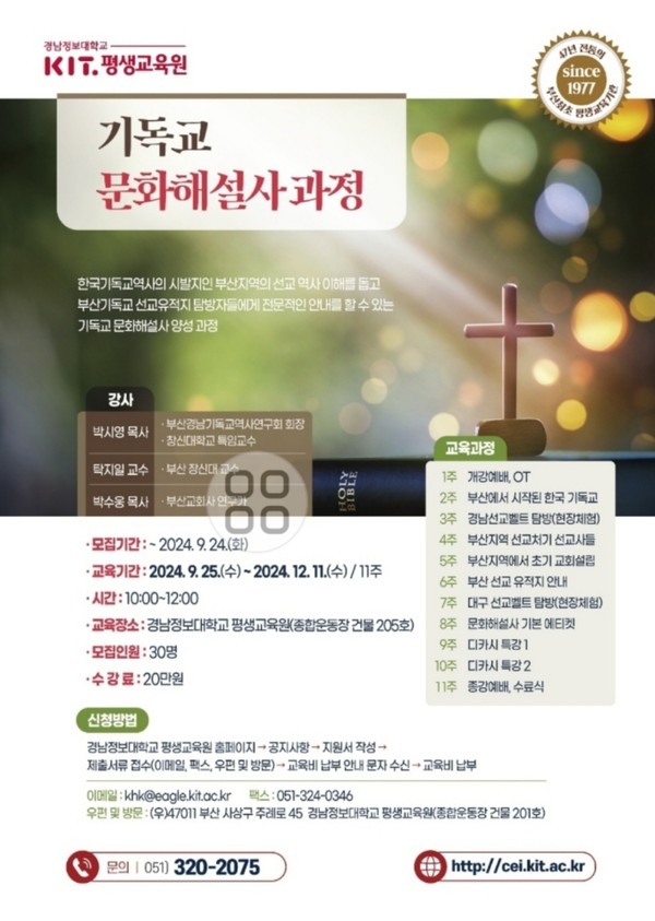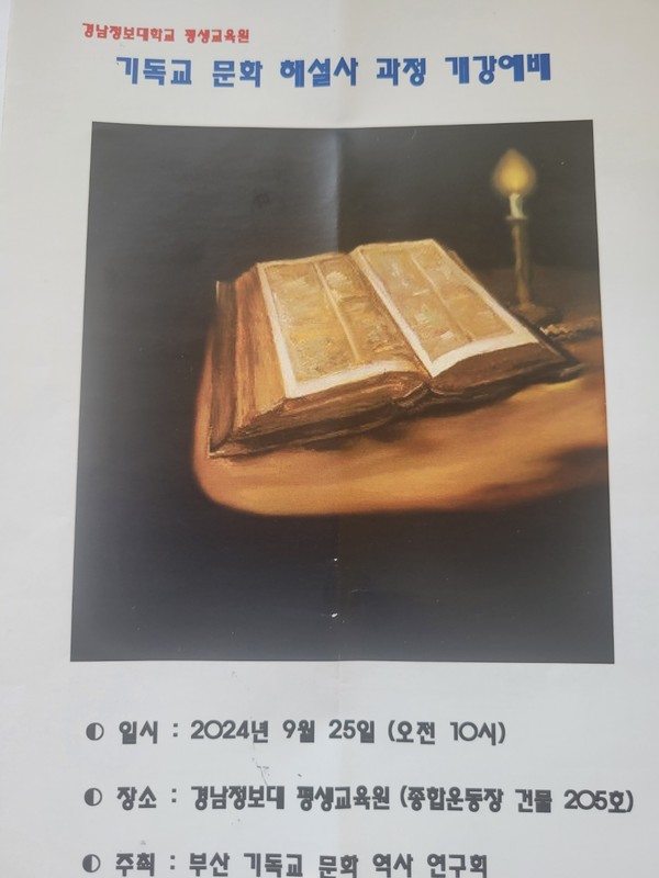 ‘기독교문화해설사 양성’을 위한 교육이 경남 정보 대학 평생 교육원에서 9월 25일 11주 과정으로 서울에 이어 두 번째 부산에서 진행되고 있다.
