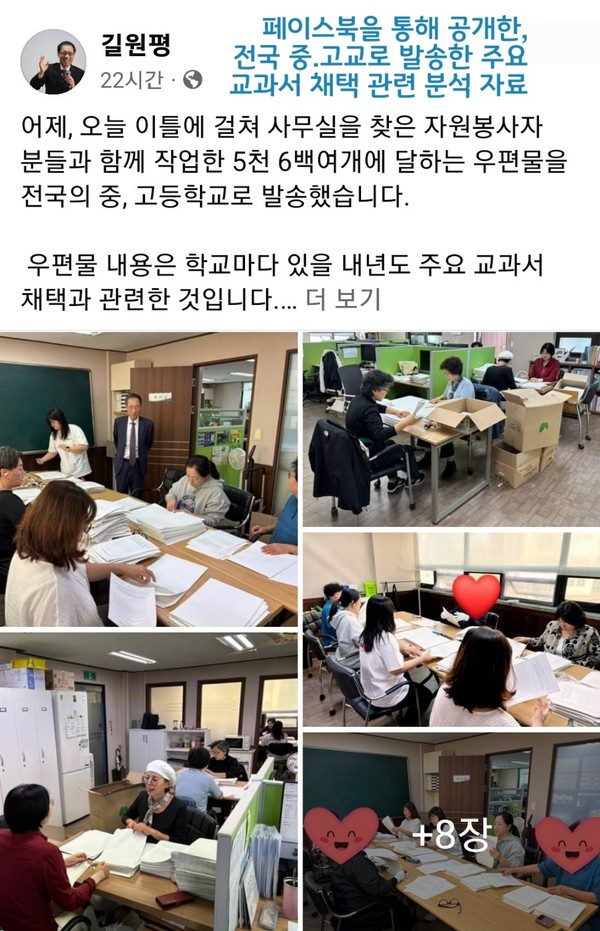그는, “보낸 공문을 참조해서, 2022년 개정 교육과정 고시를 준수하지 않은 교과서는 각 학교에서 채택하지 않기를 바랍니다. 이번에 공문 발송 작업을 위해, 자원봉사자들이 공휴일인 10월 1일에도 작업을 하였으며, 10월 2일에도 하루 종일 작업을 해서, 중학교 3,258개교, 고등학교 2,373개교, 총 5,631개교에 발송하였습니다. 자원봉사자들이 10명 정도 와서 헌신적으로 도와주는 모습이 너무 감사하였습니다. 이러한 헌신자들에 의해, 다음 세대에 올바른 교육이 이루어지길 바랍니다” 하는 길원평 교수!