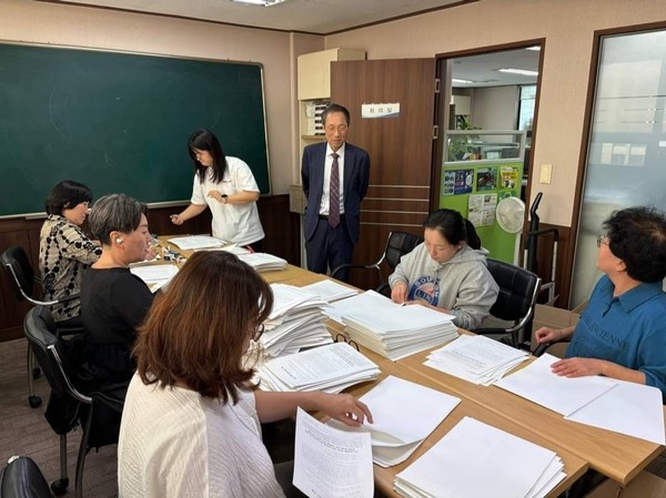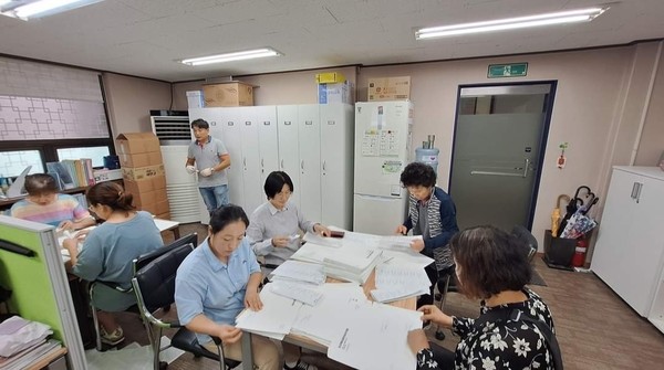 자원봉사들이 함께 하여 공문 발송하는 모습