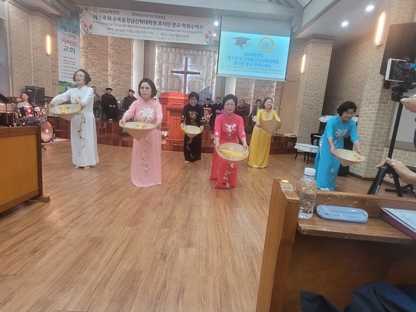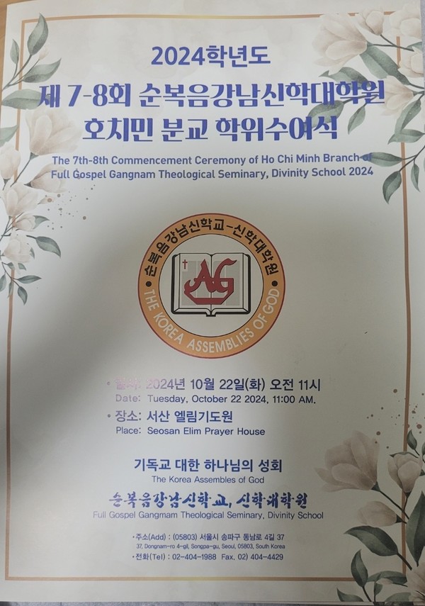 순복음강남신학대학원 호지민 분교(이하 호치민분교로 지칭) 학위 수여식이 2024년10월22일, 서산 엘림기도원(김진선원장)에서 베트남 졸업생 27명이 참석한 가운데 은헤로운 졸업식이 열렸다. 18년전에 설립된 호치민 지금까지 500여 신학생이 졸업 후 베트남 복음화를 위하여 다양한 곳에서 사역을 감당하고 있다. 금번 호치민 분교 졸업식에 27명의 석사학위 졸업자를 배출했다.