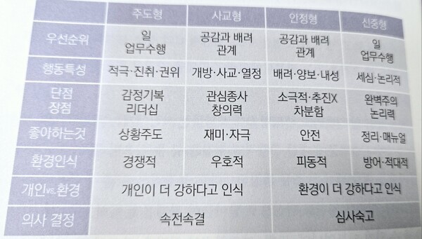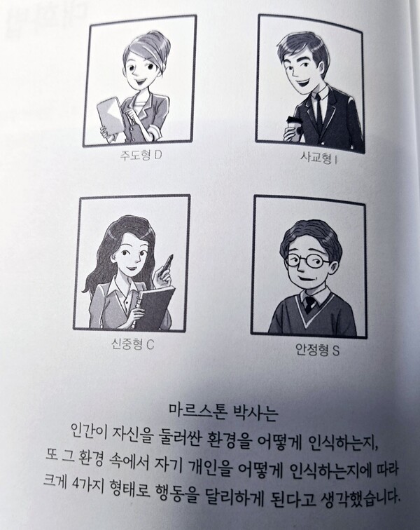 (1)마르스톤 박사는 인간이 자신을 둘러싼 환경을 어떻게 인식하는지, 또 그 환경 속에서 자기 개인을 어떻게 인식하는지에 따라 크게 4가지(주도형, 사교형, 신중형, 인정형) 형태로 행동을 달리하게 된다고 생각했다.