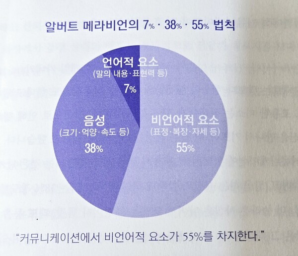 (1)알버트 메라비언의 언어적 요소(7%, 말의 내용 표현력 등)-음성(38%, 크기, 억양, 속도 등)-비언어적 요소(55%, 표정, 복장, 자세 등)법칙. 커뮤니케이션에서 비언어적 요소가 55%를 차지한다는 이론이다. 말의 내용 외에 목소리와 보디랭귀지에 대한 중요성을 강조했다.
