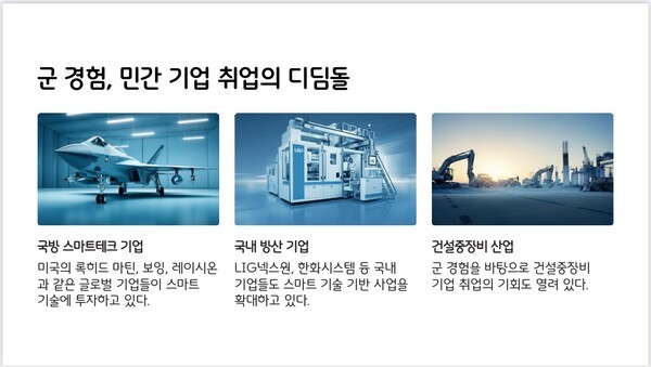 학생들은 국방스마트장비과에 입학하면 중장비 운전 기능사, 정보처리 기능사 등 다양한 자격증을 취득할 기회를 얻으며, 실무 경험을 쌓을 수 있다. 졸업 후 군 경험을 바탕으로 민간 기업 취업도 용이하다. 군 복무와 민간 경력을 모두 아우르는 전문가로 성장할 수 있다.