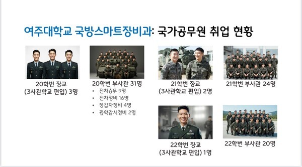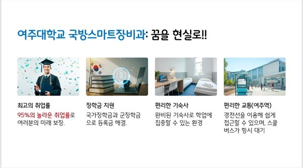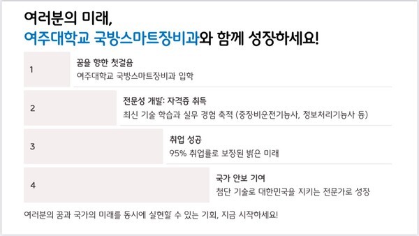 여주대학교 국방스마트장비과는 고등학교 졸업생과 청년들에게 기술 부사관 및 다양한 군 관련 직업으로 나아갈 수 있는 기회를 제공하며, 안정적인 미래를 설계할 수 있는 발판을 마련하고 있다.