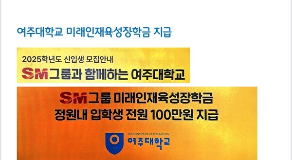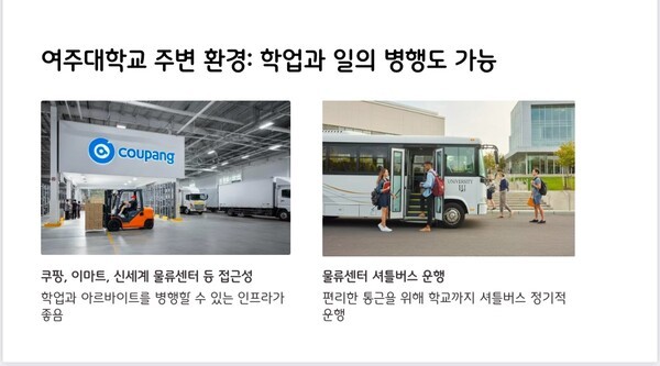 여주대학교는 미래 인재 육성을 위해 전학생들에게 재단인 SM그룹에서 장학금을 제공하고 있고, 공부와 일을 함께할 수 있는 환경을 제공한다. 쿠팡, 이마트, 신세계 물류센터 등과 가깝고, 물류센터 셔틀버스가 정기적으로 다녀 통근이 편리하다. 이런 환경은 학생들이 공부와 아르바이트를 병행할 수 있게 도와주고 있다.