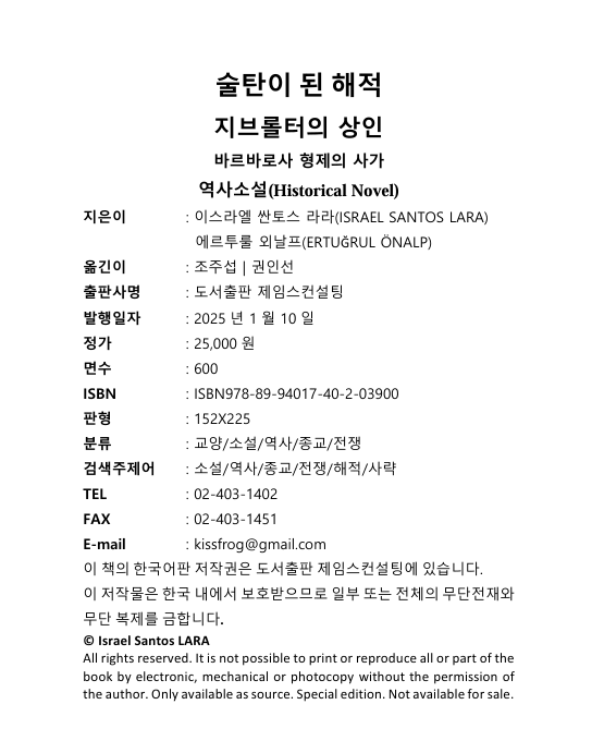 안달루시아 무슬림의 굴욕과 상처를 생생하게 그려낸 바르바로사 형제의 삶을 다룬 이 사랑과 모험의 소설은, TV 시리즈로 제작되어도 손색이 없을 만큼 흥미진진합니다. 이 소설이 독자들에게 사랑받으며 재미있게 읽히기를 바랍니다.