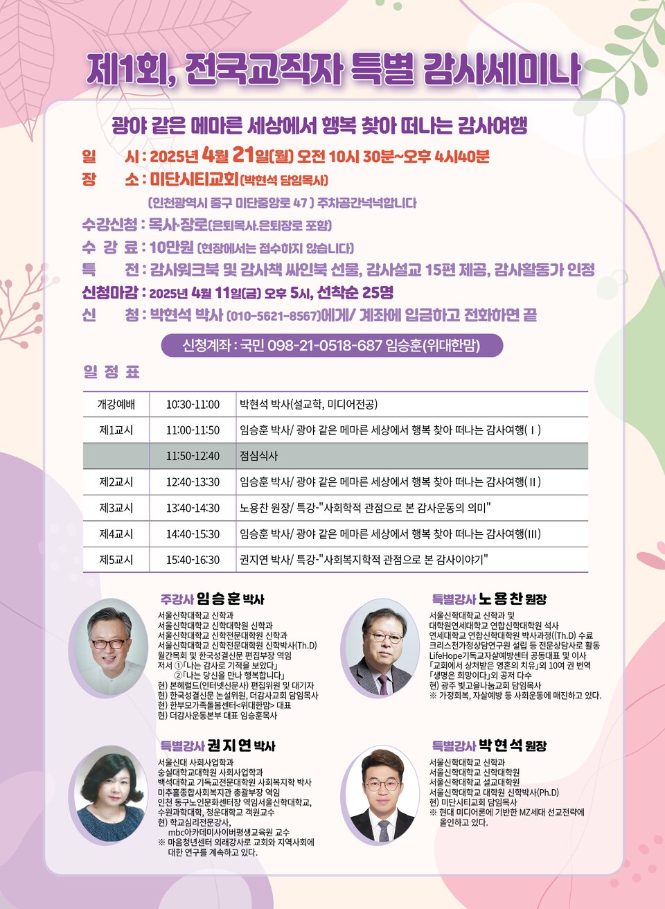 제1회 전국교직자 특별 감사세미나가 오는 4월 21일 오전 10:30~오후 4:40까지 미단시티교회(담임 박현석 목사)에서 열린다. <광야 같은 메마른 세상에서 행복 찾아 떠나는 감사 여행>이라는 주제로 열리는 이번 세미나는 전국에 감사운동을 일으킨 더감사운동본부 대표 임승훈 목사를 주강사로 나서며 특별강사로는 노용찬 원장(광주 빛고을나눔교회 담임목사, 라이프호프 공동대표), 권지연 박사(서울신대 교수, MBC아카데미사이버평생교육원 교수), 박현석 원장(서울신대 대학원 박사, 미단시티교회 담임)가 강의를 맡는다.