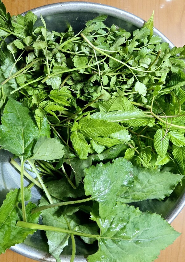 올해 처음 미나리, 취, 능개숭마를 수확했다. 이것은 다년생이라 겨울 잠을 자고 나온것이다. 땅의 영향을 마음껏 먹고 자란것이다. 2025.4.15 아침식재료가 되었다.