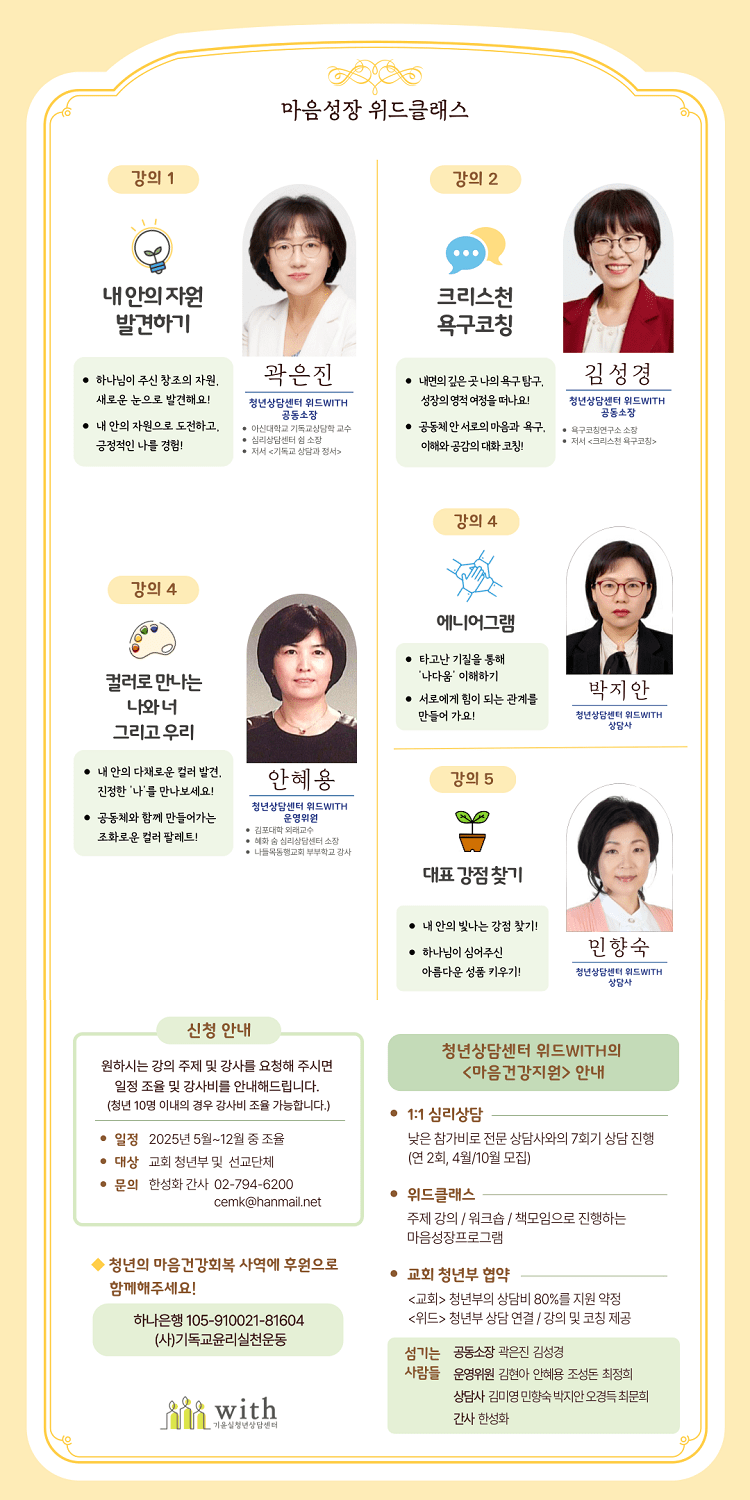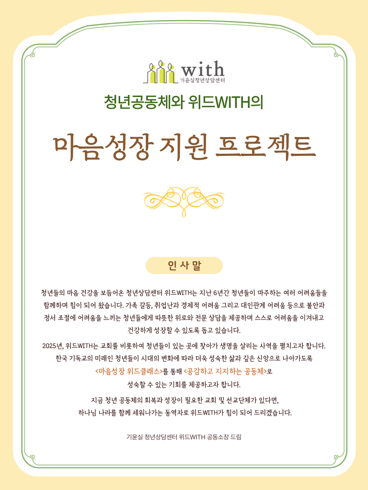 2025년, 위드WITH는 교회를 비롯하여 청년들이 있는 곳에 찾아가 생명을 살리는 사역을 펼친다. 한국 기독교의 미래인 청년들이 시대의 변화에 따라 더욱 성숙한 삶과 깊은 신앙으로 나아가도록 <마음성장 위드클래스>를 통해 <공감하고 지지하는 공동체>로 성숙할 수 있는 기회를 제공하는 계획을 세웠다.