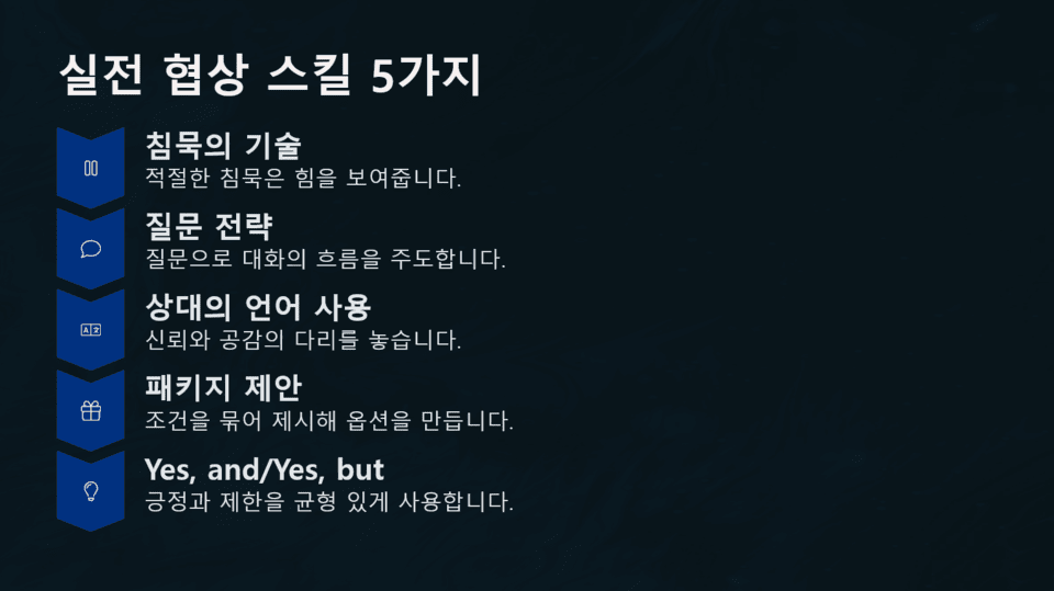 한광훈 이사장은 CEO는 끊임없는 시뮬레이션과 이미지 트레이닝으로 협상을 준비해야 한다고 말했다. 이어 한 이사장은 “협상이란 무엇인가? 그것은 전략적 커뮤니케이션이다. 일방적인 승리는 올바른 협상의 목표가 될 수 없다. 협상의 최선의 결과는 Win-Win 이다. 상호 좋은 결과를 낳는 것이 가장 좋은 협상이다.”