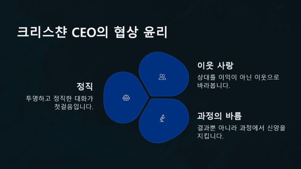마지막으로 한광훈 이사장은 “협상은 스킬보다 준비된 태도가 중요하다. CEO의 솔직한 자세는 신뢰를 준다. CEO가 정직하고 투명하게 협상에 임하는 것이 중요하며, 특히 크리스천 CEO는 이웃을 사랑하는 마음을 늘 마음에 품어야 한다.”라고 말했다.