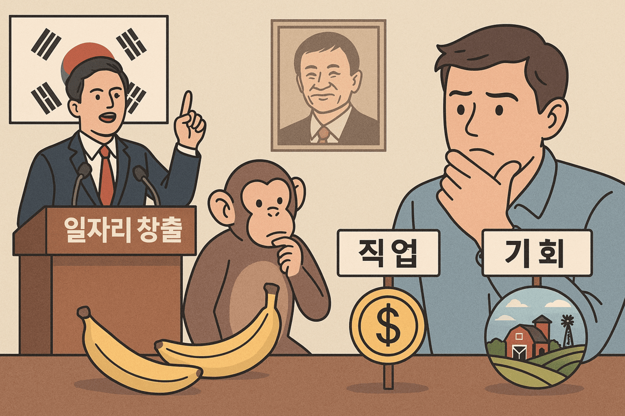지금의 한국 정치는, 그리고 많은 유권자들의 기대는, 이 원숭이의 선택에서 크게 다르지 않다. 우리는 여전히 ‘당장의 일자리’라는 바나나에 몰두하고, '시스템을 소유할 수 있는 기회'라는 돈에는 관심을 두지 않는다.