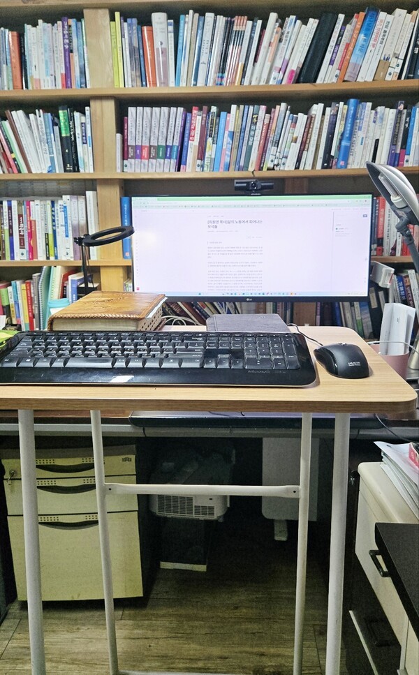컴퓨터 앞에 앉아 있는 시간이 어쩌면 하루 중 가장 많은 시간 보내는 것 같다. 앉아서 작업하다보면 아래뱃살 두둑, 다리가 자연스럽게 약해지는 것은 필수 코스다. 컴 작업을 할 때 높은 다이위에 마우스와 자판기를 두고 서서 한다.
