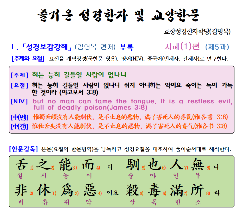 [요절] 야고보서 3:8 “혀는 능(能)히 길들일 사람이 없나니 쉬지 아니하는 악 (惡)이요 죽이는 독(毒)이 가득한 것이라”