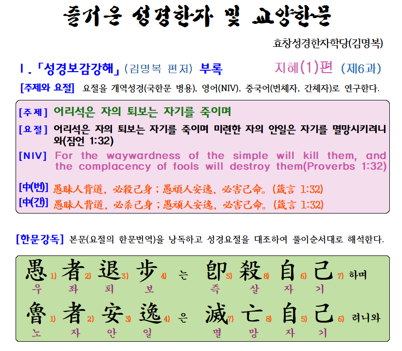 [요절] 잠언서 1:32 “어리석은 자의 퇴보(退步)는 자기를 죽이며 미련한 자의 안일(安逸)은 자기를 멸망(滅亡)시키려니와”
