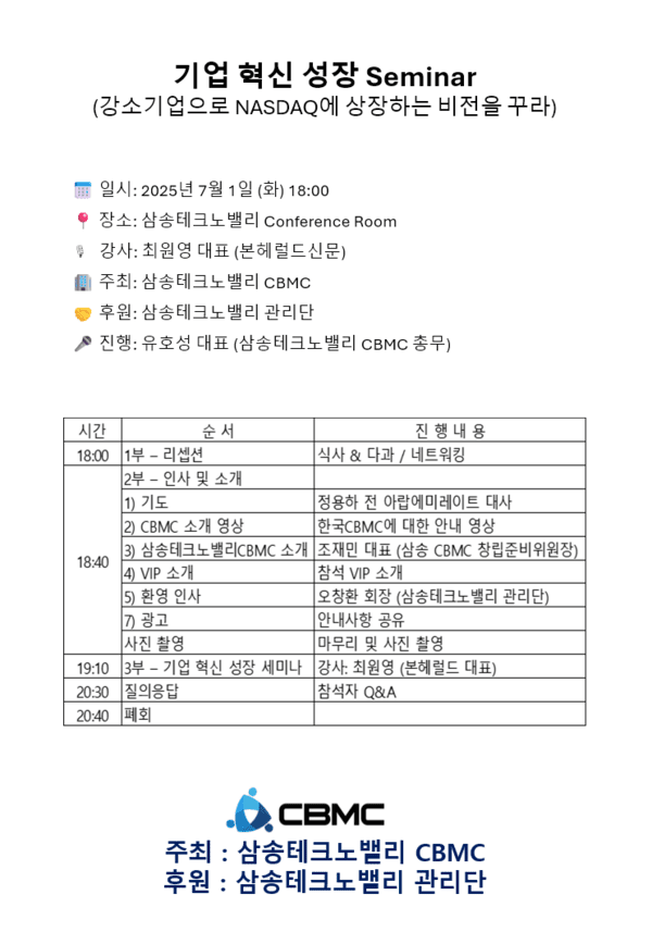 CBMC 삼송 테크노밸리 창립을 위한 준비 모임이 지난 2025년 7월 1일(화) 오후 6시, 고양시 삼송 테크노밸리 컨퍼런스룸에서 열렸다. 이번 행사는 삼송 테크노밸리 CBMC가 주최하고, 삼송 테크노밸리 관리단이 후원하였다.