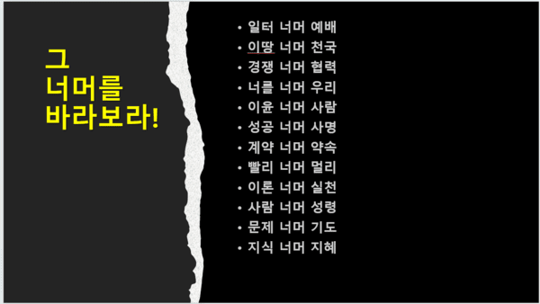 항상 현실은 팍팍하다. 그 너머를 항상보라. 믿음의 세계는 항상 그 너머를 바라보는 것이다. 이 땅 너머 저 하늘, 현실 너머 미래, 절망 너머 희망, 십자가 너머 부활, 등 너머의 가치를 소중하게 여기라. 현실은 항상 냉혹하다. 무너지지 않는 비결이 있다. 내일이 있다는 것을 알면 삶의 자리가 어둠에 거닐지라도 어둠에 지배당하지 않는다. 뚫고 일어나는 에너지가 내안에서 생긴다. 그 너머를 바라보라. 그래야 무너지지 않는다.