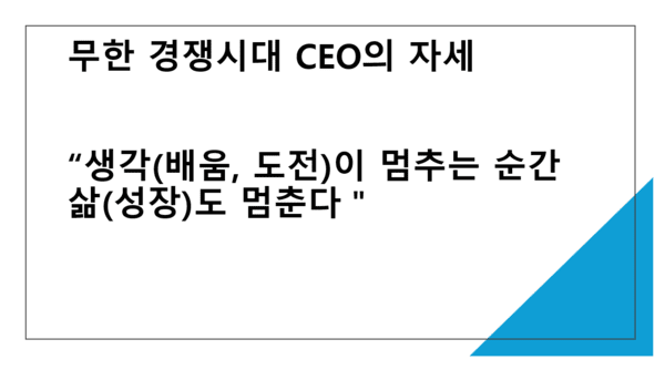 기업의 현실은 그리 만만하지 않다. 그러나 너무 힘들게만 생각하지 말라. 미래는 우리의 것이다. 그 너머를 꿈꾸고 바라보는 자들의 세계이다.