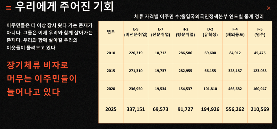 손 선교자가 제시한 자료에 따르면, 국내 체류 외국인 인구는 지난 30년간 폭발적으로 증가해 1990년 5만 명에서 2025년에는 271만 명에 이를 전망이다. 장기체류 비자를 지닌 이주민 수도 꾸준히 증가하며, 한국사회는 이미 ‘다문화사회’로 진입한 상황이다.